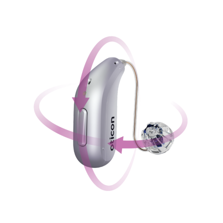 The Oticon Intent features 4-D user intent sensors that allow the hearing aid to adapt to your listening needs in the moment, from group conversation to one-on-one. The sensors determine your intent by detecting: